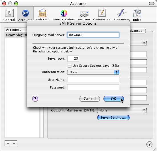 - In the Outgoing Mail Server box, the Outgoing mail server (SMTP) box, type in smtp.<enteryourfulldomainname> or if you are using your ISPs outgoing e-mail server then a name from the list below (i.e. mail.telus.net):
