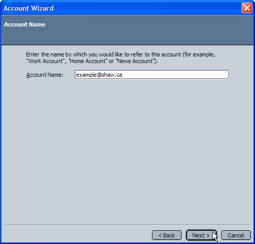 - In the Account Name box, type in the user name assigned to you (usually your complete email address including domain name). Click Next.